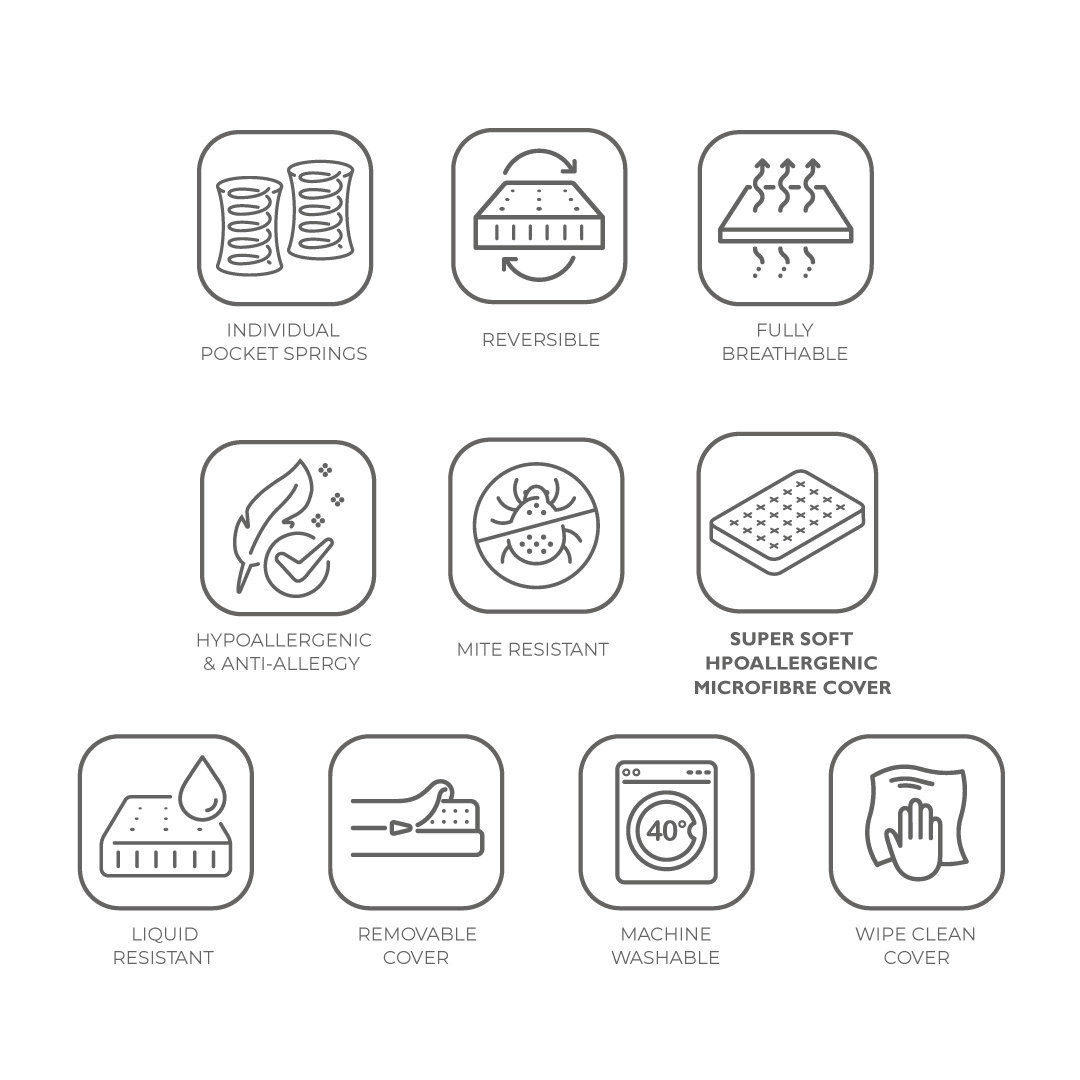 The BabyStyle Dream Hypoallergenic Pocket Spring Mattress features a unique Microfibre quilted cover that is incredibly soft and comfortable for your baby. This mattress is hypoallergenic, anti-allergy and mite resistant and because of its water repellent qualities, the interior stays fresh and clean. Its individually pocket-sprung core ensures maximum support and comfort, while the reversible design prolongs the mattress’s life. The classic quilted cover can be removed, it is machine washable up to 40 degrees and is fully breathable and air permeable.